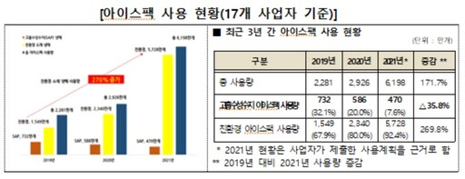 17개 사업자가 사용한 아이스팩은 2019년 2281만개에서 2020년에는 2926만개로 증가했다. 이 중 친환경 아이스팩 사용량은 같은 기간 67.9%에서 80.0%로 늘었다.