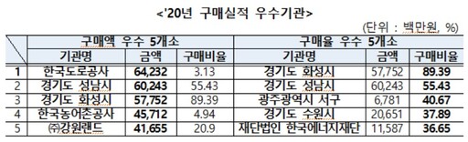 이 중 한국도로공사가 642억원으로 구매액이 가장 컸다. 이어 경기 성남시(602억원), 경기 화성시(577억원), 한국농어촌공사(457억원), 강원랜드(416억원) 순이었다.