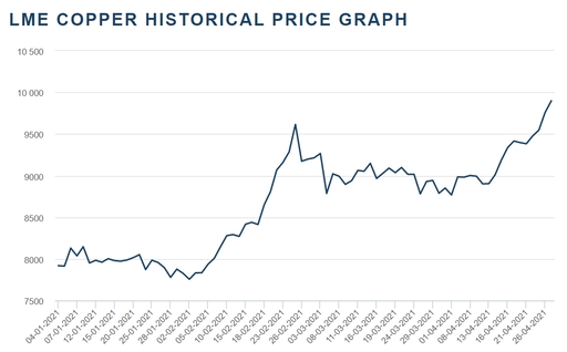 지난 27일(현지시각) 런던금속거래소(LME)에서 구리 가격은 전 거래일보다 1.43% 증가한 톤당 9898.50달러를 기록했다. 지난 2011년 8월 1일 9827달러 이후 10년 만에 최고치다. 구리 가격은 이날 9965달러까지 치솟기도 했다.