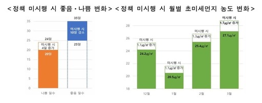 정부가 2차 미세먼지 계절관리제를 추진한 결과 초미세먼지 평균 농도가 감소한 것으로 나타났다. 초미세먼지 농도가 '나쁨'을 기록한 일수는 4일 줄어들고, '좋음'을 나타낸 일수는 10일 늘어났다.