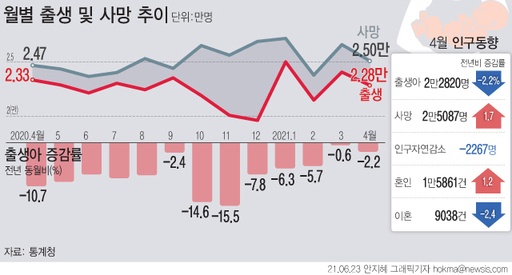 4월 기준 출생아에서 사망자를 뺀 인구 자연증가분은 -2267명이었다. 이 같은 자연감소는 2019년 11월 이후 18개월째 이어지고 있다.