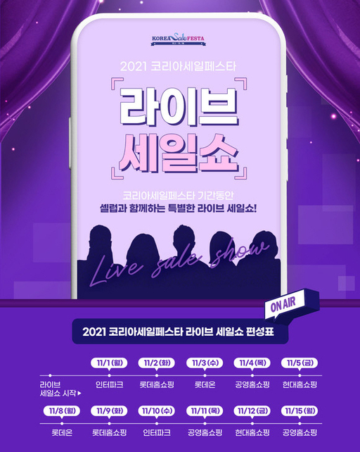 특히 최근 큰 인기를 끄는 라이브 커머스를 통한 세일쇼가 행사 기간 내내 이어질 예정이다. 공영홈쇼핑, 롯데온, 롯데홈쇼핑, 인터파크, 현대홈쇼핑은 '라이브 세일쇼' 행사에 참여해 셀럽과 함께 하는 방송을 진행한다. 아울러 국내 우수기업 해외진출을 돕기 위해 충국 최대 e커머스 플랫폼인 타오바오에서도 라이브커머스가 진행된다.