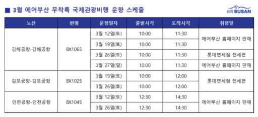 에어부산은 3월에도 무착륙 국제관광비행 운항을 지속한다. 3월 한 달간 김해국제공항에서 4회, 김포국제공항에서 2회. 인천국제공항에서 2회 운항한다. 김해공항에서는 ▲3월 12일(토) ▲3월 19일(토) ▲3월 26일(토) ▲3월 27일(일)에 각 1편씩 운항한다. 김포공항에서는 ▲3월 19일(토) ▲3월 26일(토), 인천공항에서는 ▲3월 12일(토) ▲3월 26일(토)에 각 1편씩 운항한다.