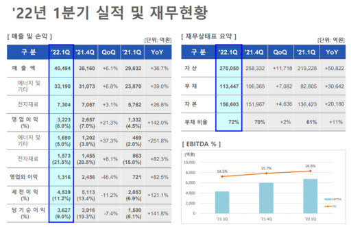사업 분류별로도 호실적이 이어졌다. 에너지 및 기타 부문의 매출은 3조3190억원으로 전년 동기 대비 39%, 전분기 대비 6.8% 증가했다. 영업이익은 1650억원으로 전년 동기 대비 251.8%, 전분기 대비 37.3% 증가했다.