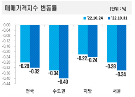 한국부동산원 관계자는 "가격 하락 우려에 따른 매수 심리 위축과 추가 금리 인상 예정에 따라 매수 문의는 극소한 상황"이라면서 "현재 급매물에서 추가적인 가격 하향이 발생해도 거래 성립 여부가 불투명한 상황이 지속되면서 하락폭이 확대됐다"고 설명했다.