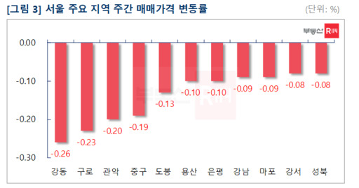 서울 25개구 중 보합(0.00%)을 기록한 3곳(금천, 종로, 중랑)을 제외한 나머지 지역이 하락했다. 지역별로 ▲강동(-0.26%) ▲구로(-0.23%) ▲관악(-0.20%) ▲중구(-0.19%) ▲도봉(-0.13%) ▲용산(-0.10%) ▲은평(-0.10%) 등이 떨어졌다.