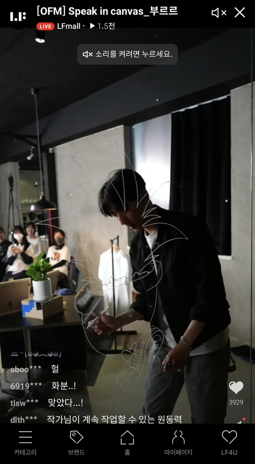 지난달 28일 LF몰 OFM(Orange From Mars)은 주목받는 1999년생 Z세대 작가 부르르(boooruru)가 직접 자신의 작품 세계를 소개하고 실시간 드로잉도 선보이는 라이브방송을 진행했다. 그는 오일파스텔로 어린이의 순수함을 담은 그림으로 2030 팬덤을 보유한 신예 작가다. 이날 진행한 방송은 누적 조회수 2600여 회에 1만5000여 개의 '좋아요'를 기록했다. 이날 방송에서는 작품 2점과 티셔츠, 머그컵 등의 굿즈가 판매됐다.