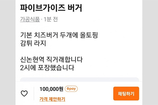 파이브가이즈에 고객이 몰리면서 웃지 못할 사건도 있었다. 오픈 첫날 중고거래 플랫폼에 파이브가이즈의 치즈버거 2개와 감자튀김 라지 사이즈를 총 10만원에 판매하겠다는 글이 올라왔다. 실제 가격은 치즈버거 각 1만 4900원과 감자튀김 라지사이즈 1만 900원으로, 5만 9300원의 웃돈을 얹은 셈이다..