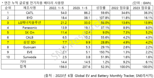 LG에너지솔루션은 올해 1~5월 점유율이 13.9%로 국내 기업 중 유일하게 상승하며 점유율 3위를 기록했다. 국내 업체들의 성장세가 돋보이는 와중에 국내 3사의 점유율은 23.3%로 전년 동기 대비 2.5%p 하락했다. 삼성SDI는 점유율이 전년 동기보다 0.7%p 하락한 4.2%로 집계됐다. SK온의 올해 1~5월 시장 점유율은 5.2%로 전년 동기(7.3%) 대비 2.1%포인트(p) 떨어졌다. SK온과 삼성SDI의 시장점유율 순위는 각각 5위, 7위였다.