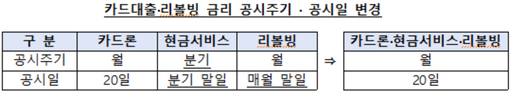 아울러 현금서비스·리볼빙의 금리 공시일을 '매월말'→'20일'로 변경한다.