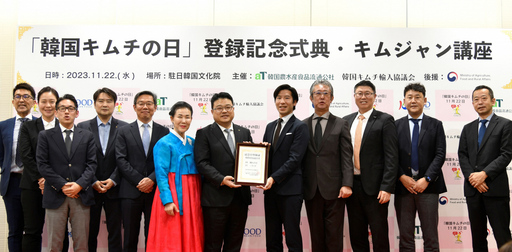특히 일본에서 민간 차원의 기념일을 등록·관리하는 '일반사단법인 일본기념일협회'가 매년 11월 22일을 '한국 김치의 날'로 등록한 것을 기념하는 등록증 수여식을 함께 진행해 의미를 더했다.