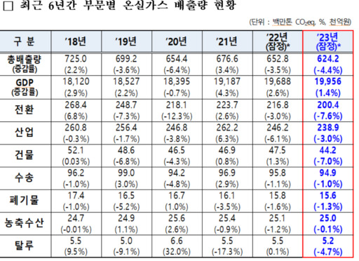 10일 환경부 소속 온실가스종합정보센터가 발전 등 분야별 유관지표 등을 활용해 '2023년 국가 온실가스 잠정 배출량'을 분석한 결과에 따르면 지난해 온실가스 배출량은 전년 대비 4.4% 감소한 6억2420만톤(t)으로 나타났다.