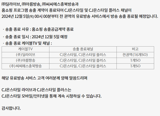 현재 송출이 중단된 채널에서는 "CJ온스타일에서 방송 제공을 중지해 방송이 중단되고 있습니다"라는 안내 문구만 표시되고 있다.