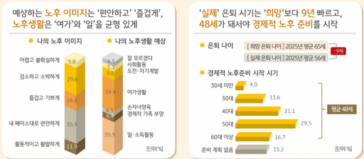 은퇴연령은 평균 56세로 빨라졌는데 실제 노후 준비는 미흡한 것으로 나타났다. 특히 경제력은 노후 행복의 핵심요소로 꼽혔지만 준비 정도는 가장 미흡했다.