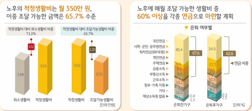 노후 생활비 조달가능금액 중 60% 이상은 국민연금·퇴직연금·개인연금·주택연금 등의 연금을 활용해 마련하겠다고 답해 연금에 대한 기대가 높았다. 그 밖에 부동산 소득·근로소득·정부 및 가족 지원 등을 예상하기도 했다.