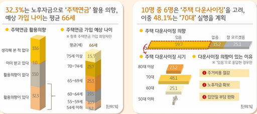 노후자금 준비 방법 중 하나인 '주택연금'의 경우 92.2%의 응답자가 알고는 있었지만 가입할 의향이 있는 가구는 32.3%에 그쳤다. 주택 다운사이징을 통한 노후자금 준비는 응답자의 59.7%가 활용할 의향이 있다고 밝혔으며, 시기는 70대를 선호했다.