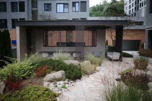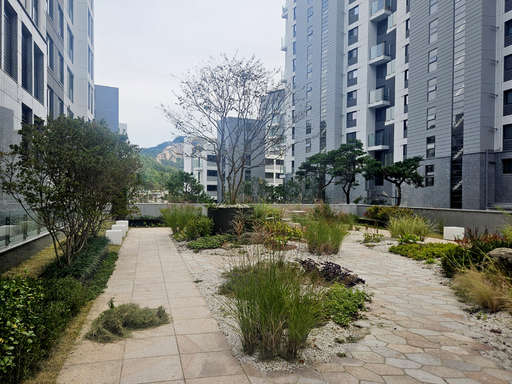 단지의 고저차를 이용해 조성된 힐가든은 층단형 공간이다. 단순히 이동을 위한 길이 아닌 보행로 곳곳에 '스테이존(Stay Zone)' 개념을 적용해 잠시 머물러 교류할 수 있도록 각 레벨마다 정원, 벤치, 전망 포인트가 놓여져 있다.