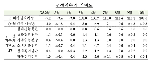 28일 한국은행에 따르면 10월 소비자심리지수(CCSI)는 109.8로 전월 대비 0.3포인트(p) 하락했다. CCSI는 소비자동향지수(CSI)중 6개 주요지수를 이용하여 산출한 심리지표다. 장기평균치(2003년 1월 ~ 2024년 12월)를 기준값 100으로 해 100보다 크면 장기평균보다 낙관적임을, 100보다 작으면 비관적임을 의미한다.