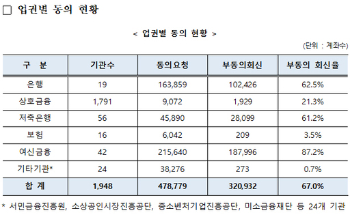 업권별로는 여신금융회사(87.2%)가 중개형 채무조정 거부율이 가장 높았고, 은행(62.5%)과 저축은행(61.2%)이 뒤를 이었다. 비영리기관인 상호금융기관(21.3%)과 담보대출 비중이 높은 보험사(3.5%), 재단·공공기관 자체대출(0.7%)에서는 거부율이 상대적으로 낮았다.