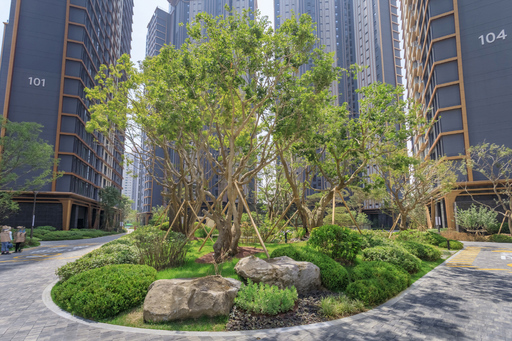 파티오 가든은 단지 중심부에 작은 숲처럼 꾸며졌다. 바닷바람을 맞고 자라 독특한 형태가 특징인 팽나무들이 심어졌으며, 팽나무 외에는 높지 않은 관목과 초화로만 구성했다.