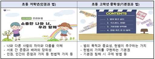 교육부와 법무부는 학생 대상 헌법 전문강사 강의를 지원한다. 올해 하반기부터 초등학교 205개교 603학급, 중학교 71개교 311학급 등 총 276개교 914학급에서 법무부 소속 헌법 전문강사가 교과 및 창의적 체험활동 시간을 활용해 강의를 진행하고 있다. 강의 내용은 헌법이 추구하는 가치, 기본권과 인권, 법의 역할 등이며, 학생들이 쉽게 이해하고 체험할 수 있도록 구성됐다. 학생 대상 헌법교육은 내년부터 고등학교까지 확대될 예정이다.