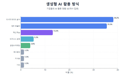 응답에 따르면 기업들은 AI를 '리서치·데이터 분석 및 인사이트 도출'(38.2%)이나 '상시 업무 프로세스의 효율적 증가'(35.5%) 등을 위해 주로 활용하고 있는 모습이다. 'AI 사용 경험이 없다'는 답변은 단 1곳(1.3%)에 그쳐 많은 기업들이 AI를 업무에 다양하게 활용하고 있다.