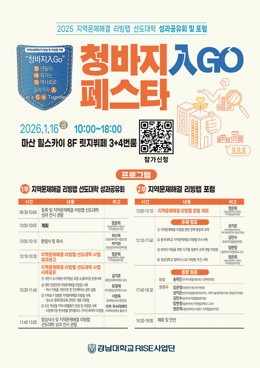 청바지入GO페스타는 지역 문제 해결 리빙랩 선도대학 성과 공유회 및 포럼으로, 2025년 한 해 동안 지역 사회와 대학이 협력해 추진한 지역 문제 해결 리빙랩 성과를 공유하고 확산하기 위해 마련됐다.