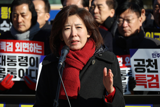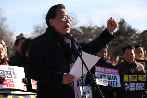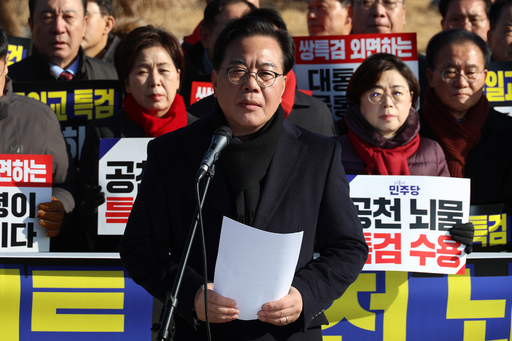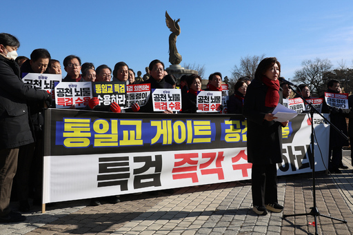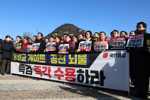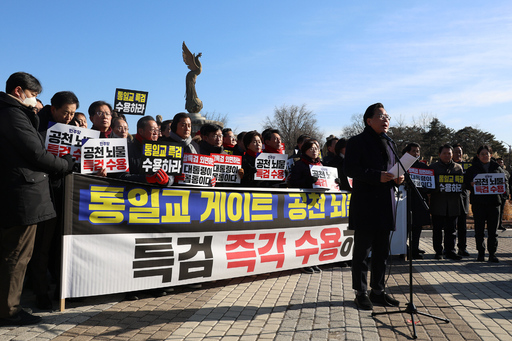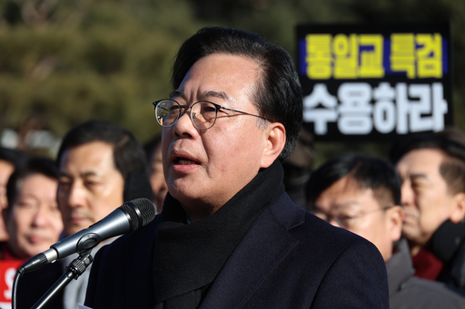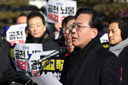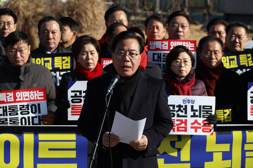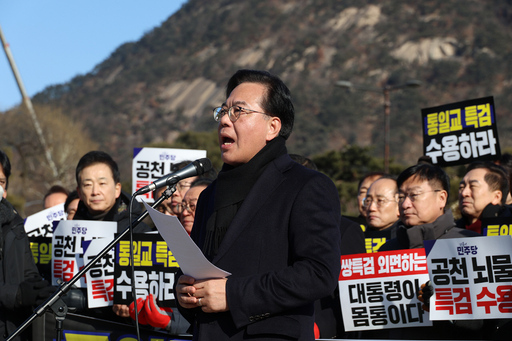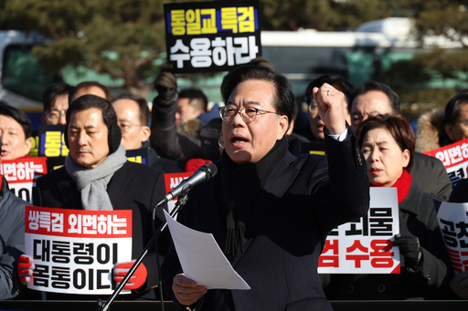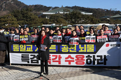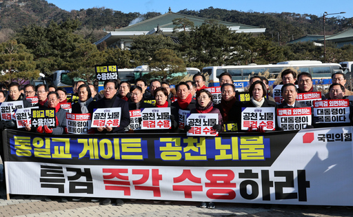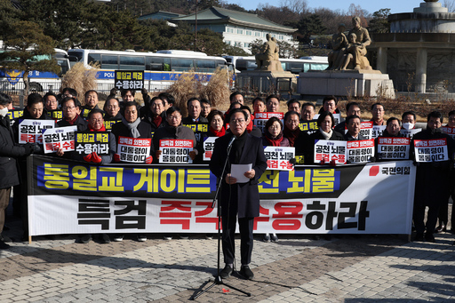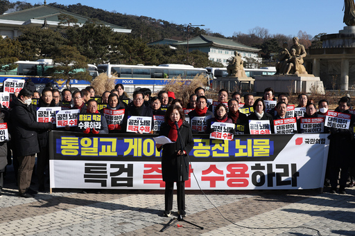 국민의힘 의원들이 20일 서울 종로구 청와대 사랑채 분수대 앞에서 열린 통일교 게이트·더불어민주당 공천뇌물 특검 촉구 규탄대회에 참석해 구호를 외치고 있다.