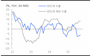 반도체 수출 주도 속, 비(非)반도체 수출 부진을 보여주는 그래프. /현대차증권