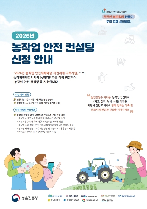 컨설팅은 농작업안전관리자가 농가를 직접 방문해 진행하며, 모든 상담과 안전물품은 무료로 제공된다. 주요 내용은 ▲작업장·농로·도로 등 위험요인 점검 및 조치 ▲농업기계·농자재 위험요인 점검 ▲소음·진동·분진·가스·농약 사용에 따른 위험도 측정 등이다.