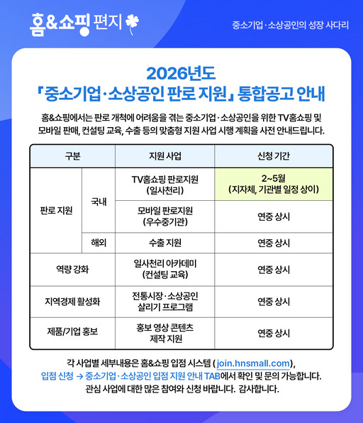 홈앤쇼핑은 '2026년도 중소기업·소상공인 판로지원 통합 공고'를 사전 안내하고 TV홈쇼핑과 모바일, 해외 수출까지 연계한 맞춤형 지원에 나선다고 25일 밝혔다.