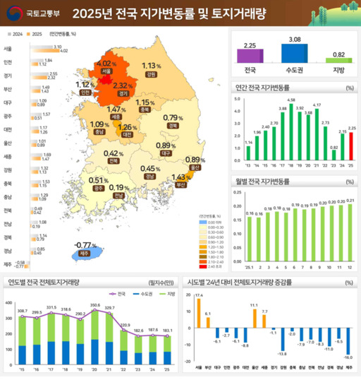 26일 국토교통부와 한국부동산원의 발표에 따르면 지난해 연간 전국 지가는 전년보다 2.25% 상승했다. 오름폭은 2024년(2.15%)보다 0.1%포인트(p), 2023년(0.82%)보다 1.43%p 커졌다.
