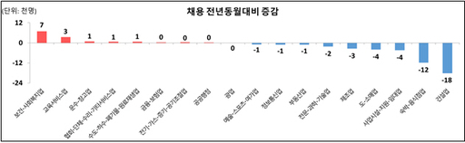 반면 건설업은 고용 한파의 직격탄을 맞았다. 지난해 종사자 수가 8만1000명 줄며(-5.6%) 전체 산업 가운데 감소 폭과 감소율 모두 가장 컸다. 도매 및 소매업은 2만9000명(-1.3%), 숙박 및 음식점업은 1만4000명(-1.1%) 감소했다.