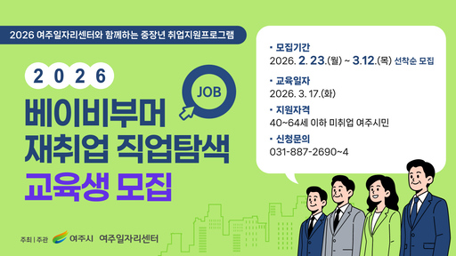 여주시는 베이비부머 세대의 재취업을 돕기 위해 베이비부머 재취업 직업탐색 특강 교육생을 모집한다고 밝혔다.