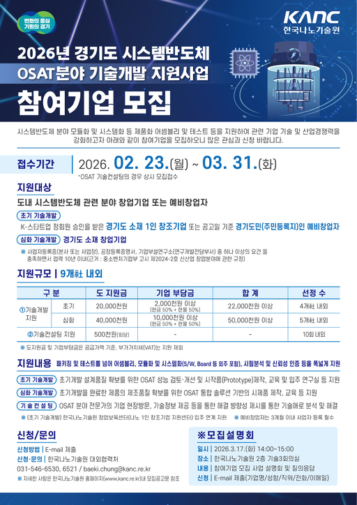 경기도는 시스템반도체 산업 생태계 강화를 위해 '2026년도 경기도 시스템반도체 후공정(OSAT) 분야 기술개발 지원사업'에 참여할 도내 예비창업자 및 창업기업을 3월 31일까지 모집한다고 밝혔다.