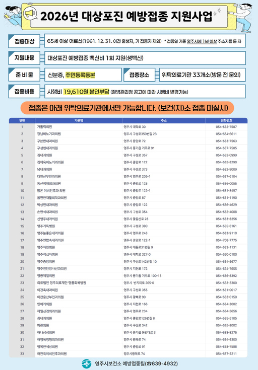 영주시는 오는 3월 1일부터 65세 이상 시민을 대상으로 대상포진 예방접종 지원사업을 시행한다. 접종 비용 부담을 낮춰 고령층의 질병 예방과 지역사회 건강 안전망을 강화하기 위한 조치다.