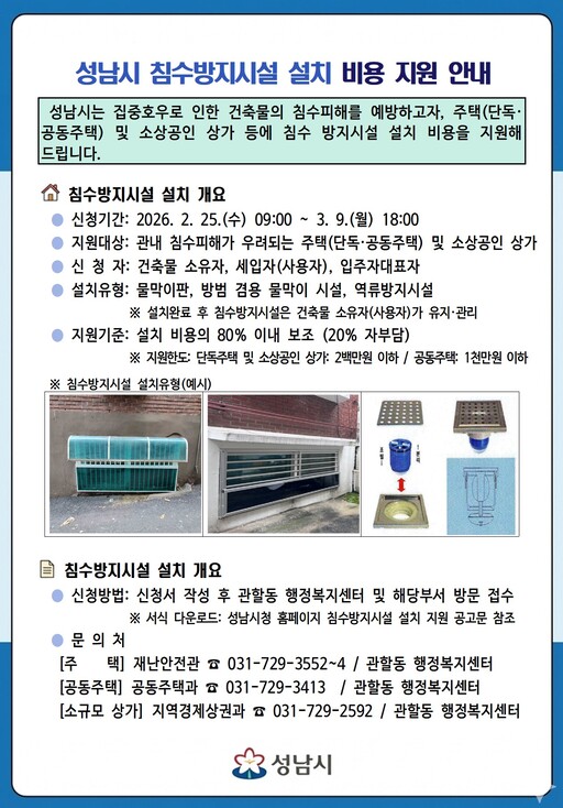 성남시(시장 신상진)가 여름철 집중호우로 인한 주택과 상가의 침수 피해를 사전에 예방하기 위해 침수방지시설 설치 비용을 최대 80%까지 지원한다.