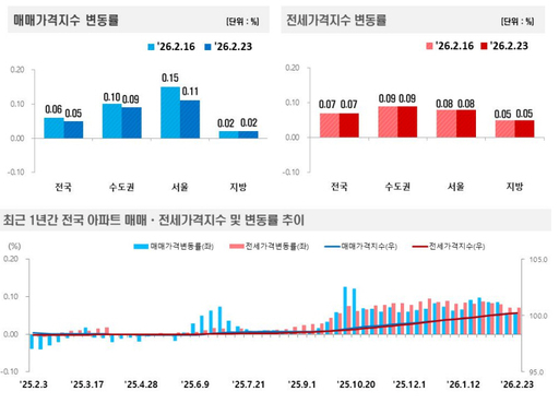 전국 아파트 가격은 0.05% 올랐고, 수도권 전체 상승률은 0.09%로 집계됐다.