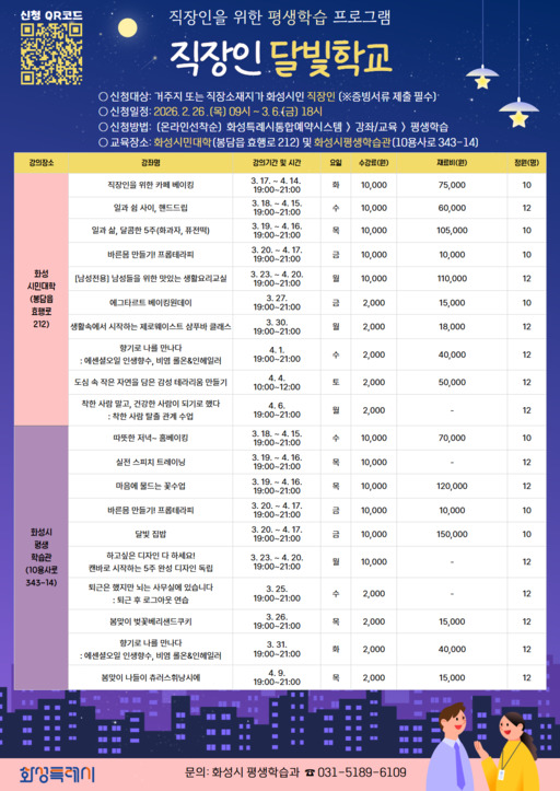 '직장인 달빛학교'는 관내 직장인과 자영업자의 평생학습 참여를 확대하기 위해 마련된 프로그램으로, 평일 야간과 주말 오전에 화성시민대학과 화성시평생학습관에서 인문교양·문화예술 분야의 다양한 교육과정을 운영한다.