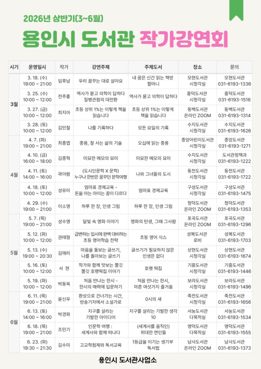 5월에는 성수영 한국경제 기자(포곡도서관), 권태형 작가(성복도서관), 김애리 작가(상현도서관), 서현 작가(기흥도서관), 박동욱 한양대 교수(보라도서관)가 강연을 진행하며, 6월에는 윤신우 작가(죽전도서관), 박경화 작가(서농도서관), 조민기 작가(영덕도서관), 김수미 작가(남사도서관, 온라인) 강연이 예정돼 있다.