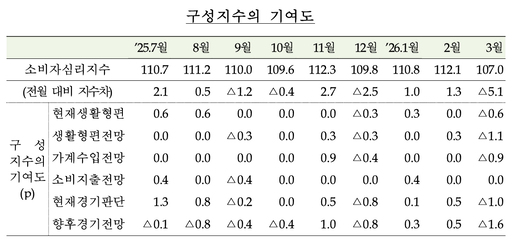 한국은행이 25일 발표한 '2026년 3월 소비자동향조사 결과'에 따르면 이달 소비자심리지수(CCSI)는 107.0으로 전월(112.1)보다 5.1p 하락했다. CCSI는 여전히 장기평균 기준선인 100을 웃돌았지만, 소비자들의 경기 인식은 한 달 사이 뚜렷하게 약화됐다. 조사기간은 이달 10일부터 17일까지다.