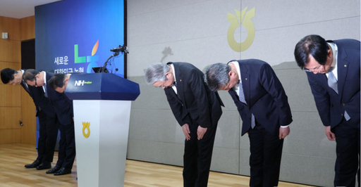 강호동(오른쪽 3번째) 농협중앙회장 및 임원들이 지난 1월13일 서울 중구 농협중앙회 본관에서 대국민 사과문을 발표하고 있다. /뉴시스