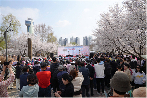 행사장 입구부터 이어진 벚꽃 터널은 방문객들의 발길을 사로잡았다. 강바람에 흩날리는 꽃잎이 공연장 위로 내려앉으며 장관을 연출했고, 시민들은 벚꽃 아래 돗자리를 펴고 앉아 봄의 정취를 만끽했다.