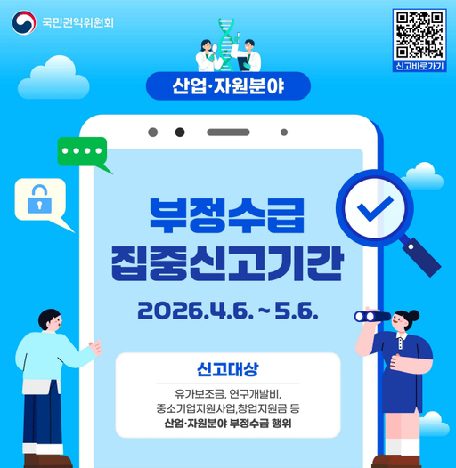 권익위는 6일부터 5월 6일까지 '산업·자원 분야 정부지원금 부정수급 집중신고기간'을 운영한다고 밝혔다.