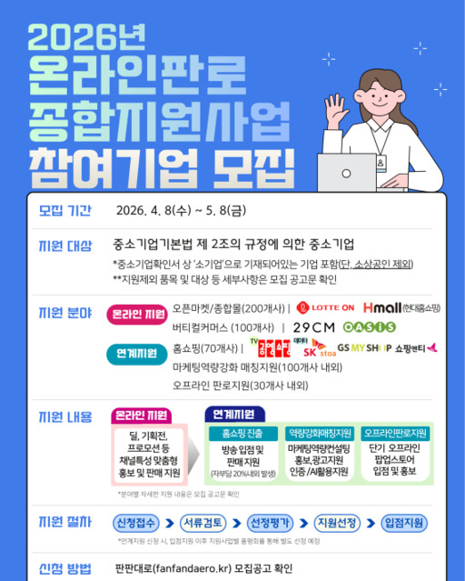 또한, 선정 기업을 대상으로 신청에 따라 연계 지원에 선별된 중소기업은 ▲홈쇼핑 입점 지원(TV 및 데이터 홈쇼핑 채널 진출) ▲마케팅 역량강화 매칭지원(마케팅역량 컨설팅, 홍보·광고 지원, 인증발급, AI활용 등 메뉴판식 지원) ▲오프라인 팝업스토어 입점의 기회도 제공할 예정이다.