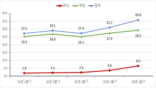 13일 한국예탁결제원이 발표한 '2026년 1분기 증권결제대금 현황'에 따르면, 올해 1분기 증권결제대금은 일평균 35조8000억원으로 직전 분기(31조1000억원) 대비 15.3% 증가했다. 전년 동기(27조2000억원)보다는 31.6% 늘어났다.