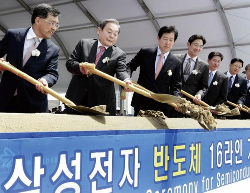 2009년 삼성전자 반도체 16라인 기공식에서 (왼쪽 두번째) (故)이건희 선대회장과 (왼쪽 네번째) 이재용 회장이 첫 삽을 뜨고 있다./삼성전자