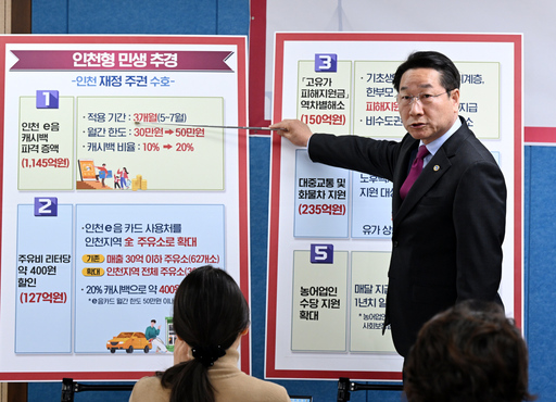 먼저 민생 안정과 소상공인 지원을 위해 지역화폐 '인천e음' 혜택을 대폭 확대한다. 다음 달부터 3개월간 캐시백 비율을 기존 10%에서 20%로 상향하고, 월 사용 한도도 30만 원에서 50만 원으로 늘려 시민 1인당 최대 30만 원의 혜택을 제공한다.