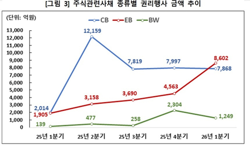 행사금액 기준으로는 EB 증가세가 두드러졌다. EB는 8602억원으로 전분기(4563억원) 대비 88.5% 늘었다. CB는 7868억원으로 1.6% 줄었고, BW는 1249억원으로 45.8% 감소했다.