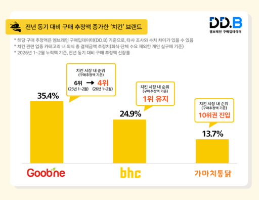 BHC 치킨은 올해 1~2월 기준 구매 추정액이 전년 대비 24.9%나 급증하며 압도적인 1위 자리를 공고히 했다. 교촌치킨은 -2.1%로 소폭 감소하며 선방했으나, BBQ는 25.7% 급감하며 상위권 내 순위 변동의 고비를 맞았다.